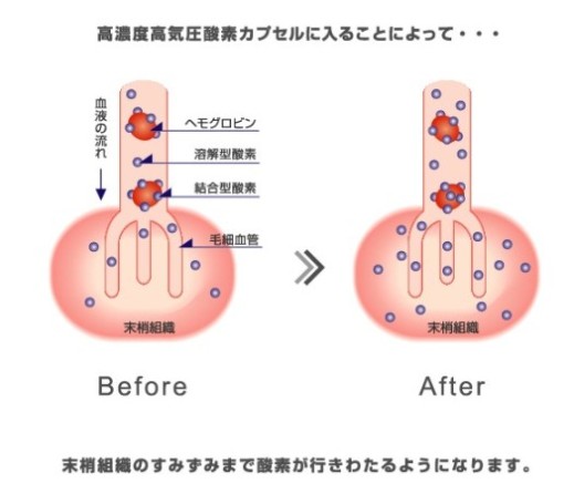 カプセル内の気圧を1.25気圧に上げ(水深3メートル程度)、酸素を直接体に溶け込ませ(ヘンリーの法則:気体が液体に溶解する量は、その気体の分圧に比例する)、この溶解型酸素を増やします。